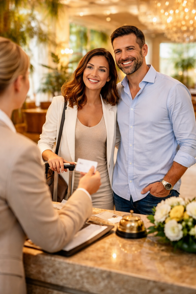Ein Paar checkt in einer hellen, eleganten Hotellobby an der Rezeption ein. Im Vordergrund übergibt eine Mitarbeiterin die Zimmerkarte, während die Gäste mit Gepäck freundlich und entspannt wirken.